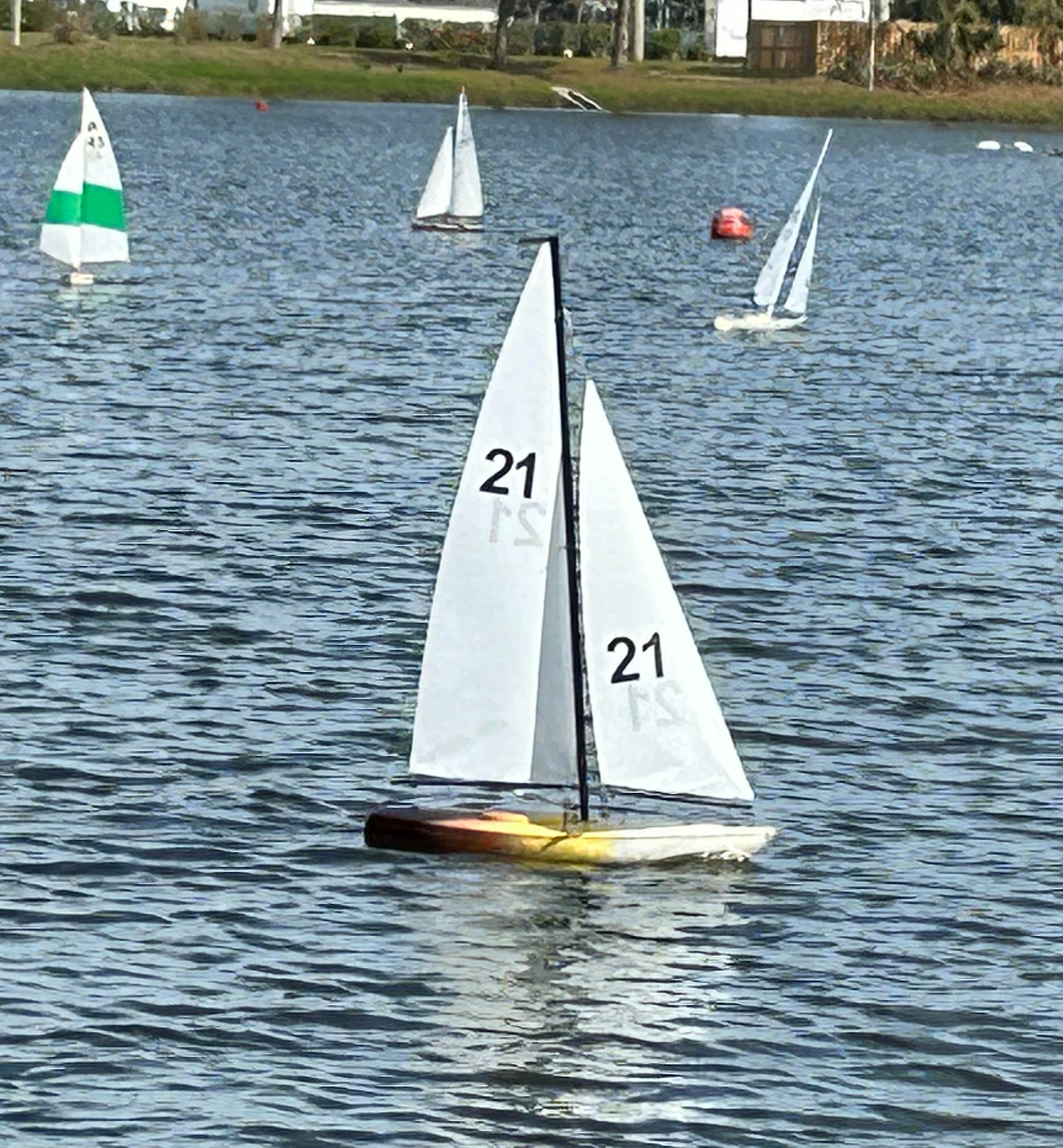 In the late 1980’s, a group of r/c sailors, who had been sailing in Orlando, received permission from the City of South Daytona to allow model sailing on the ‘unimproved’ lake, now known as Reed Canal Pond. Informal sailing went on for many years, 36/600’s, Marblehead’s, EC12 Meters, and the newly emerged Soling One Meter. Permanent buoys were put out. The city built concrete docks (still in place) at the north and south ends and in July, 1994, the South Daytona R/C Model Yacht Club received AMYA Sanction #163. One of the founders and first officers, Chuck Buzek, was elected to the AMYA Hall of Fame. The club first held a sanctioned regatta for Soling One Meters in March of 1995. Over the years the club hosted the All-Florida Soling Cup, and an annual Florida EC12 regatta. More recently, a regatta for the Dragon Flite 95 was held. The fleet of boats has evolved with the sport, with EC12’s giving way to the US12, and now to the more modern Dragon Force 65 and Dragon Flite 95, the era of the boat builder giving way to the high performance plug ‘n play models. The Soling class remains a strong class to this day. The park and pond were completely renovated in the early 2000’s with a walking path and paved parking areas, and the city, more recently, built a new dock for the club at the south end of the pond.